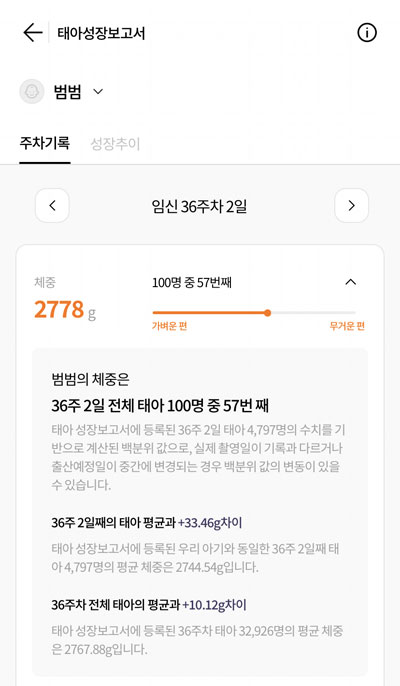 미국은 산모 체중 관리도 안 해주고 아무 고나리를 안 해주기 때문에 늘 불안에 떨었는데 "열달후에"라는 고마운 앱을 추천 받았다. 태아 스펙과 산모 체중 스펙을 입력하면 다른 사람들과 비교해 어느 정도인지 한 눈에 파악할 수 있다. 미국 시골 산모들에겐 꼭 필요한 앱이라고 생각한다. 36주차의 범범이는 6lb 2oz (2778g)로 미국에선 39%로 작은 편에 속하지만 사실 체중 관리받는 한국 아기들에 비하면 보통에서 살짝 큰 편인 것이었던 것이다!
