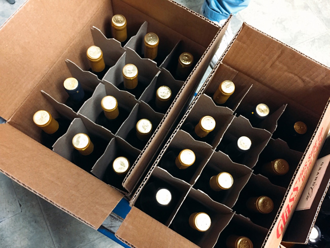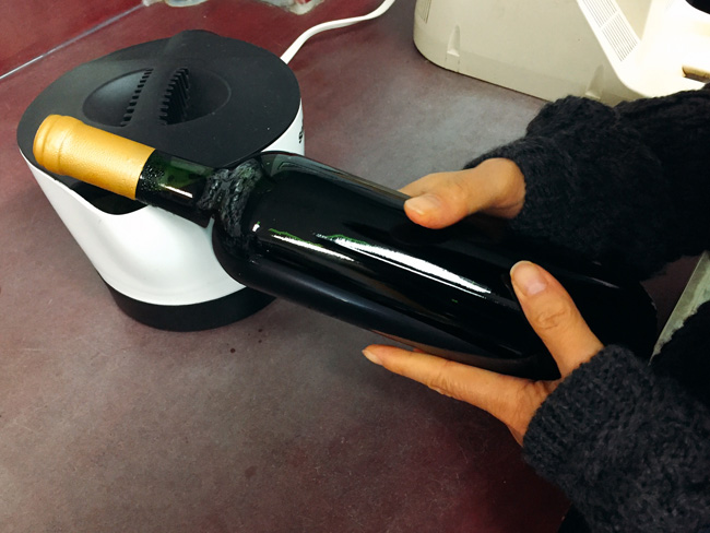 직접 병을 소독하고, 물로 씻고, 건조 후 와인을 펌프로 직접 담고 코르크를 끼워 밀봉한다.
